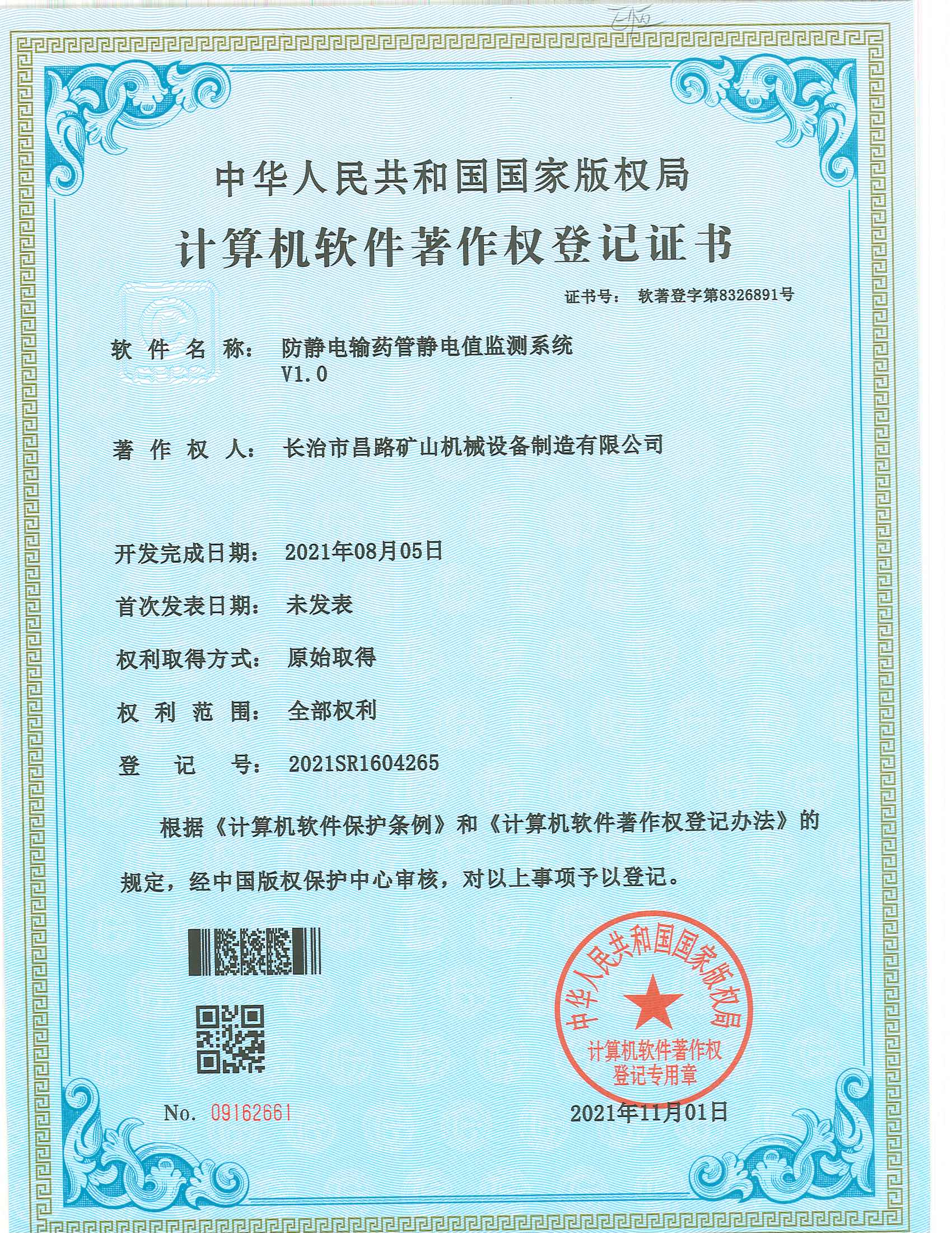 榮獲防靜電輸藥管靜電值監(jiān)測(cè)系統(tǒng)著作權(quán)登記證書(shū)